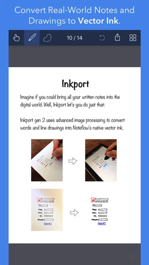 Copy and paste from the real world: Use Inkport gen 2 to snap a picture of a whiteboard or writing and convert it into Noteflow's native vector ink. No special paper needed. Then resize, re-color, or edit as if you wrote it in Noteflow.