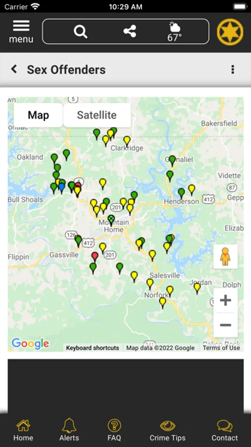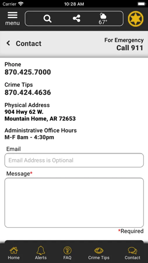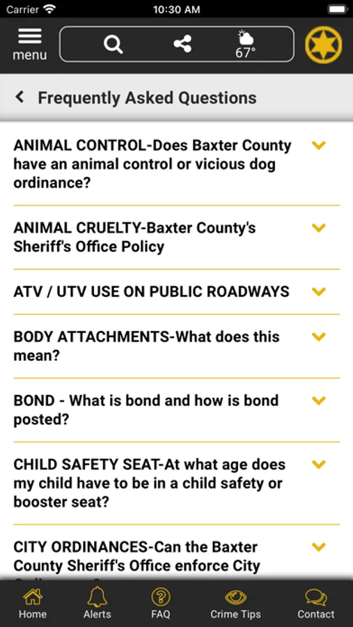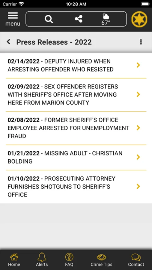 The app has public information for press releases, inmates, most wanted, sex offenders, special alerts, and FAQ's. Crime tips and contact us messages can be sent to the S.O.