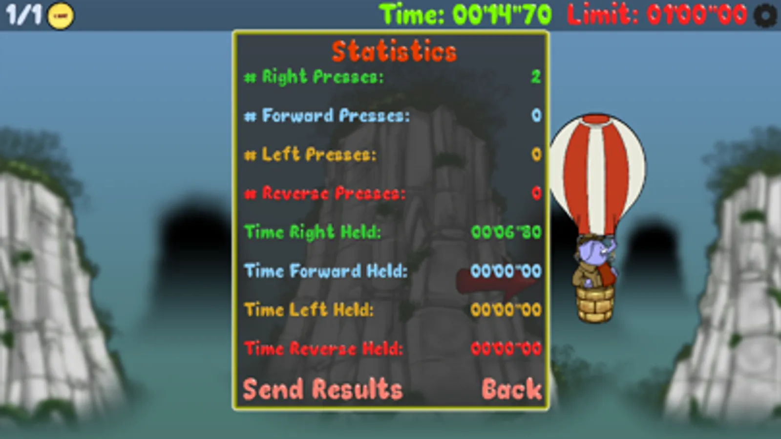 Players are scored based on three metrics which will be shown upon stage completion or failure. Switch presses and hold times are also collected. All of this information is useful for technicians so they may better serve users. With the statistics, a technician can make a better determination for the user's ability to use a certain input module, whether they improve using it over time, or if they need to try another type! Anyone can save or share these statistics by clicking "Send Results."