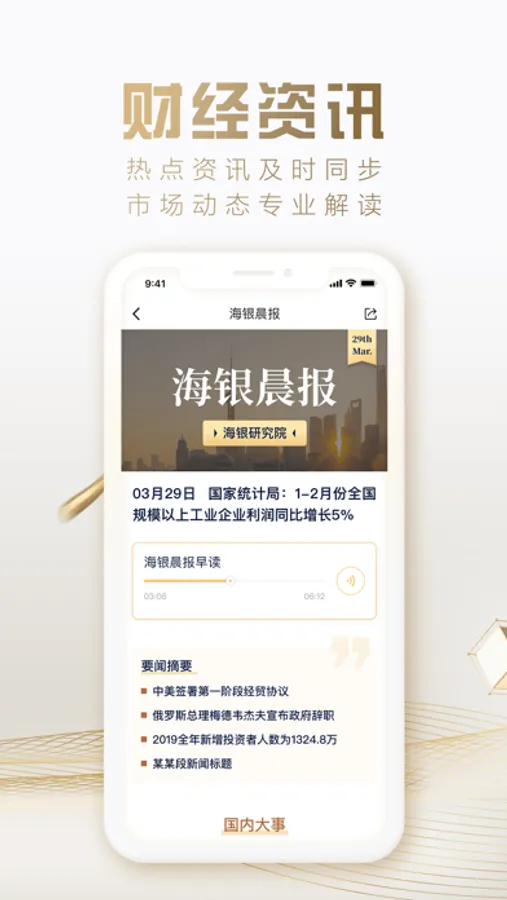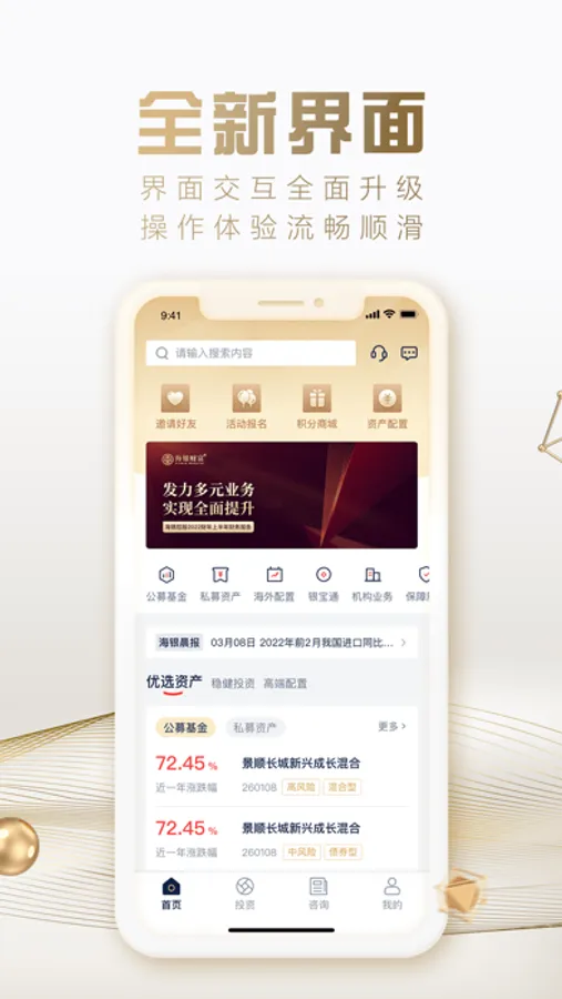“掌上海银”专业服务于海银财富客户,汇集众多实用功能,为高净值客户提供私密、专业、便捷、及时的手机端移动服务