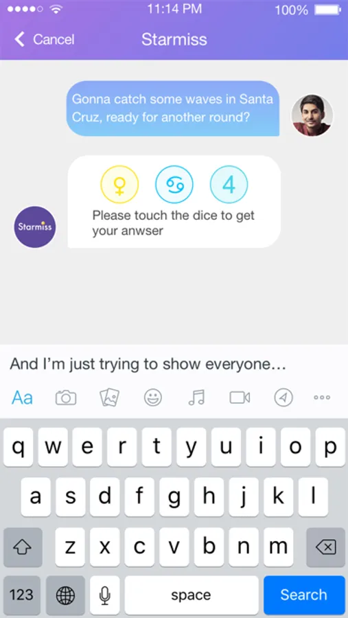 Is there anything you want to ask? Starmiss will wait for your message every hour of the day with Astrology Dice. You can interact to with the Dice by "Ask Astro Dice for help" section and you can talk with it and ask every question that you want to ask.