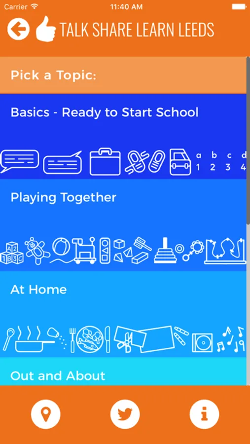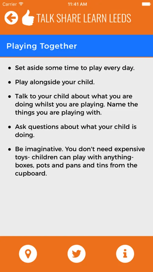 The Talk Share Learn Leeds app aims to help parents interact with their children and support their early development. Discover helpful tips to encourage learning in a range of different situations including at home or at the supermarket. Set reminders for your favourite everyday scenarios. Also find the location and details of your nearest Leeds City Council children's centre.
