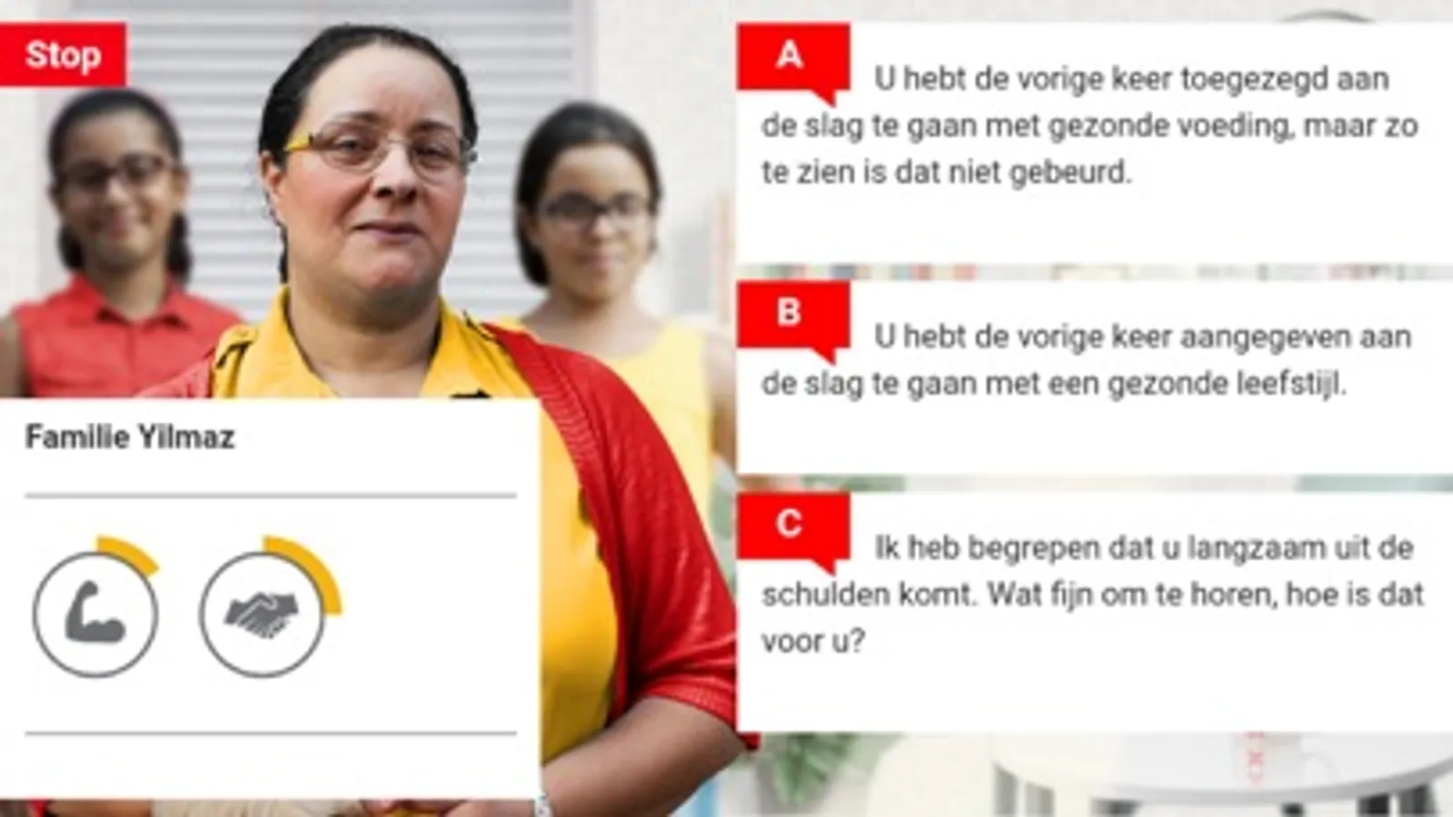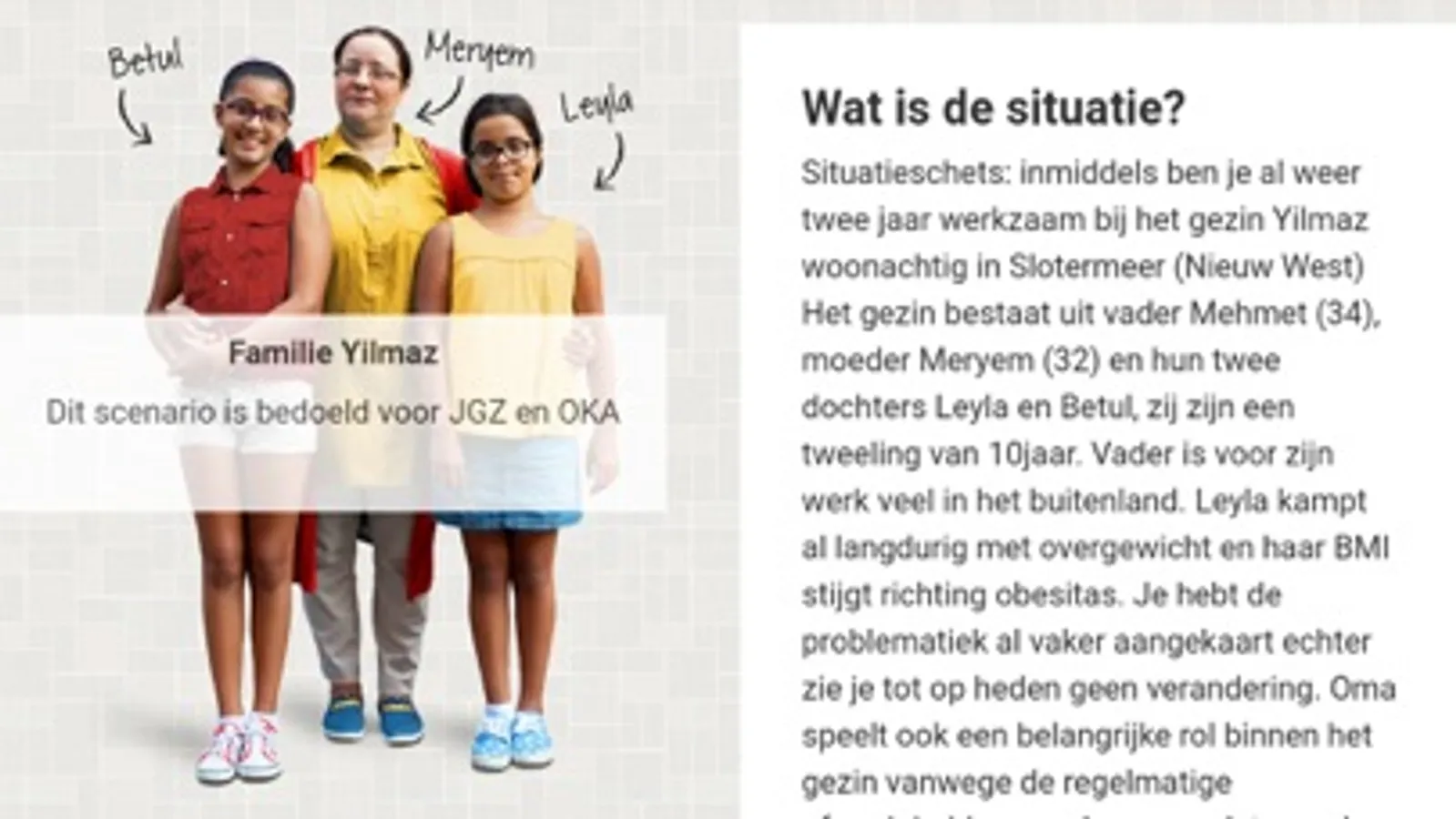 De tool helpt (zorg) professionals om te oefenen met gesprekstechnieken over gezond gewicht (leefstijl). De e-tool is een game waarin professionals kunnen oefenen met een concrete casus ofwel gezin.