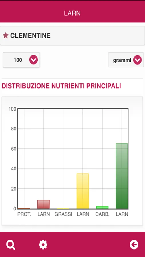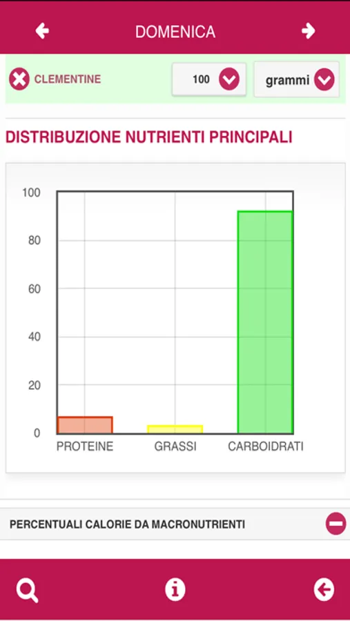 • Generali: Proteine, Carboidrati, Lipidi/Grassi con la suddivisione in percentuale, supportata da una visualizzazione grafica