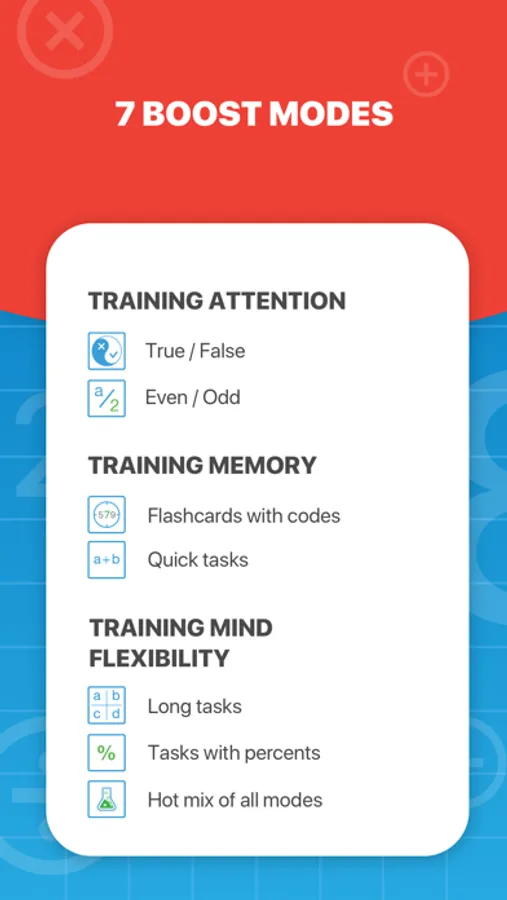 'Math Brain Booster' consists of different training modes, each of them consists of sequences of simple arithmetical tasks.