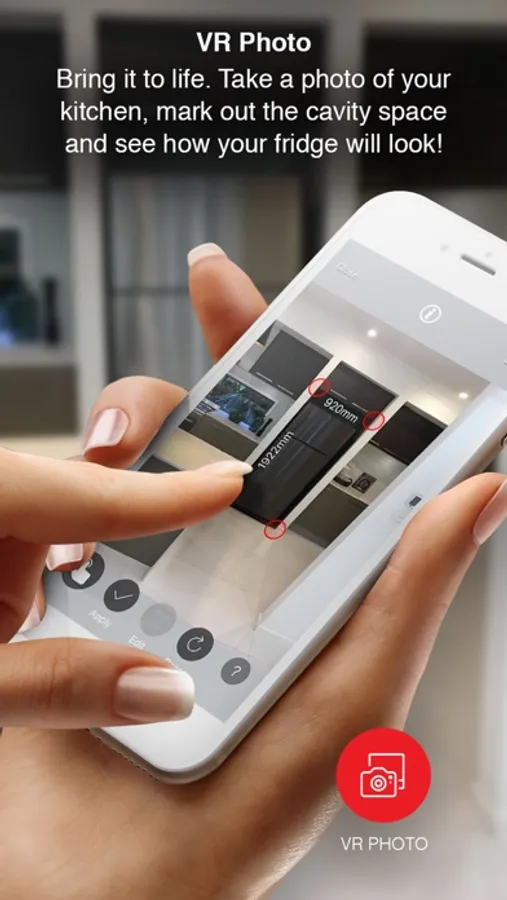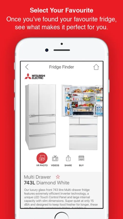 See how your favourite fridge will look in your current kitchen. Simply take a photo of your kitchen, outline the fridge cavity space and the Mitsubishi Electric Fridge Finder App will do the rest. You will be able to see a generated photo of the fridge in your kitchen! You can change fridge models, or change colours. Thinking of going black? See how it will look with the VR Photo feature. You can even save and share this photo with friends and family with a tap of a button to get their opinion and see their reaction.