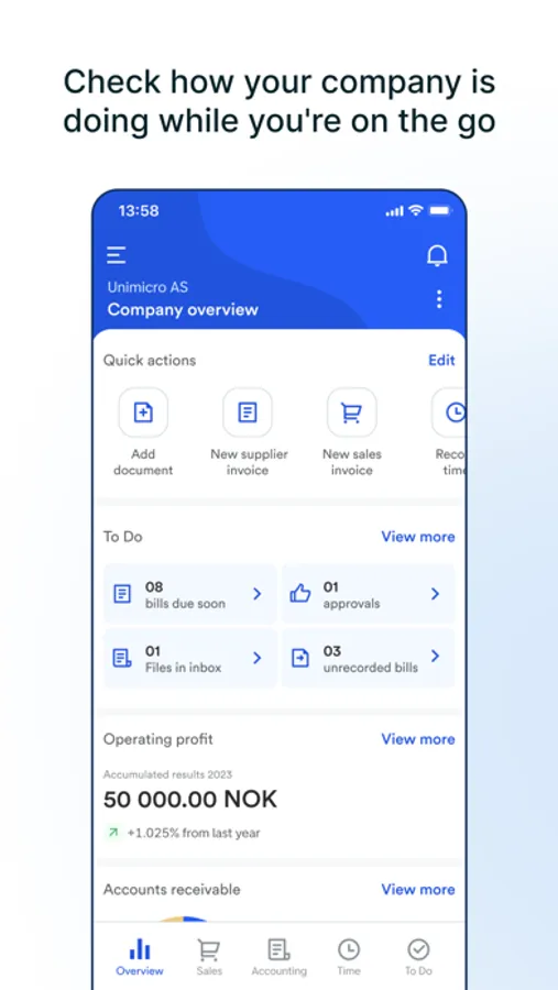 The userfriendly accounting system. Log hours on the go, link them to orders and projects. Create customers and invoices with few clicks. Save time by paying and booking incoming invoices, and approve hours to be transferred to payroll – all of this in the app!