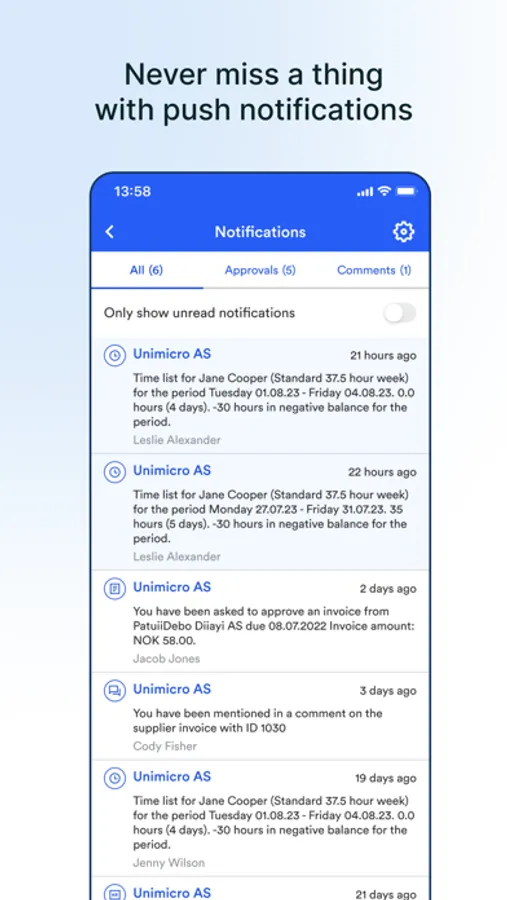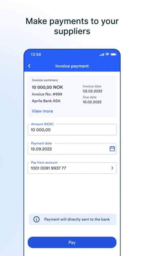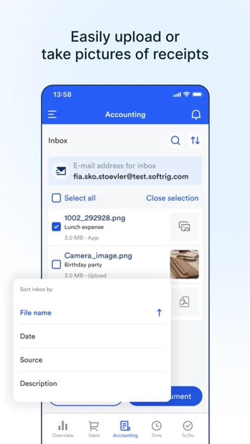 Follow up incoming invoices. See what is due, give the necessary approvals for payment, or pay and post to the accounts directly. Take a photo of the receipt, outlay and invoice, attach a comment and submit!