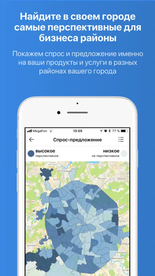 · Автоматический расчет спроса и предложения. Бизнес-навигатор покажет, в каком районе города ваш бизнес получит больше клиентов с учетом расположения конкурентов, количества жителей и сотрудников офисов и предприятий поблизости.