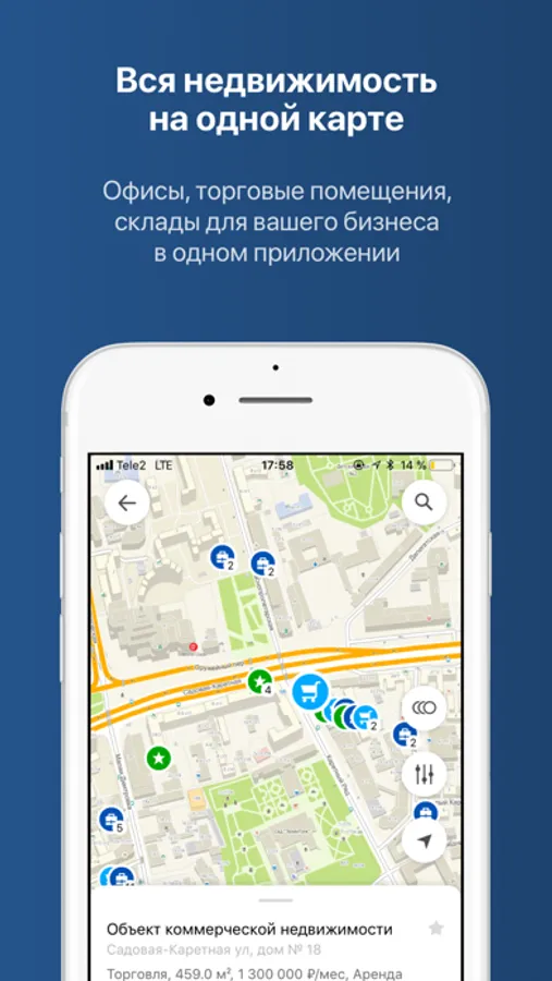 · Встроенный поиск недвижимости. На карте вы увидите свободные помещения, которые можно арендовать для вашего бизнеса. База обновляется дважды в неделю.