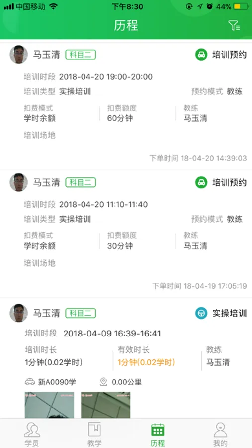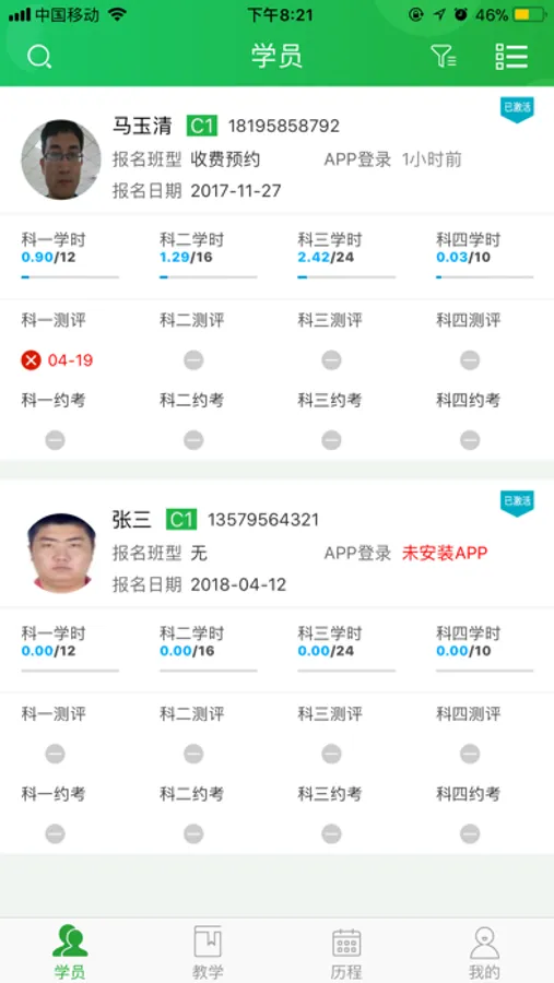 学员管理:通过APP直接查看学员预约情况,及学员实时学时状况。