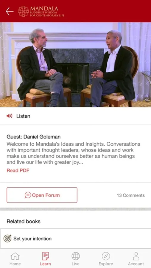 On download, introduction to The Mandala App and 30 – 40 secs preview of most of the content is available free. (Includes video lectures by Thupten Jinpa, conversations with global expert, introduction to meditation, guided meditations, talk on ‘Buddha the Psychologist’, events and publications).