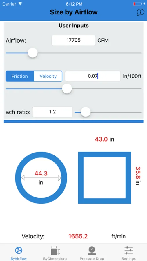 In the “Size By Airflow” tab you can input the airflow, friction or velocity and the aspect ratio. The app calculate the round (diameter) dimension and the equivalent rectangular diameter based on aspect ratio that you desire. It also calculate the velocity (if you input the friction) and the friction (if you input the velocity)