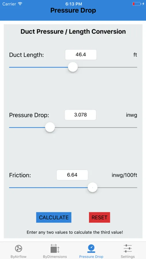 In "Pressure Drop" tab, you can convert between duct length, pressure drop, and friction find out the pressure drop of a given installation. You can also calculate the maximum duct length that can be used at a desired pressure drop.