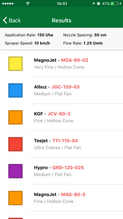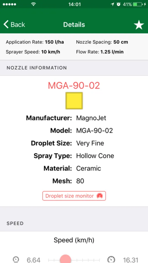 By choosing a nozzle and clicking on it, the application brings information like manufacturer, model and color. Below is a graph showing the speed range required to maintain drop size and working pressure.