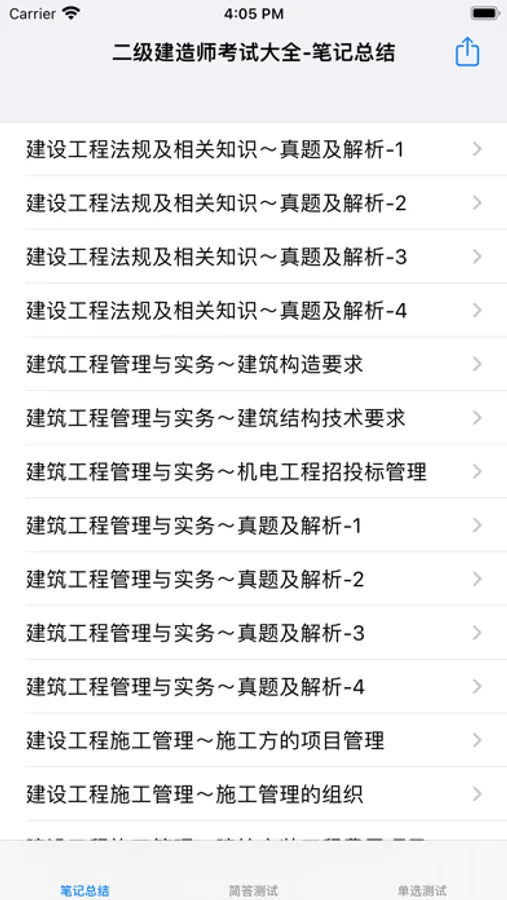 本应用包含二级建造师考试以下内容:建设工程法规及相关知识,建设工程施工管理 ,建筑工程管理与实务,公路工程管理与实务 ,市政公用工程管理与实务 ,机电工程管理与实务 ,水利水电工程管理与实务 ,矿业工程管理与实务。