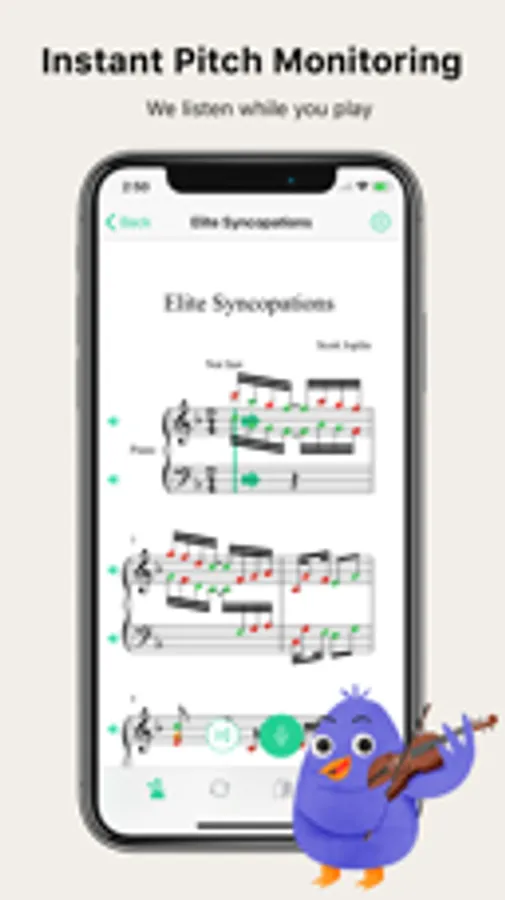 With Practice Bird you can easily achieve your musical goals and efficiently refine your skills - by yourself or with your teacher. Practice Bird will listen to you play and will give you real-time feedback with our incredible Instant Pitch Monitor audio signal processing technology. You can adjust the tempo to your needs, listen to the piece and hide parts you don’t want to see or hear.