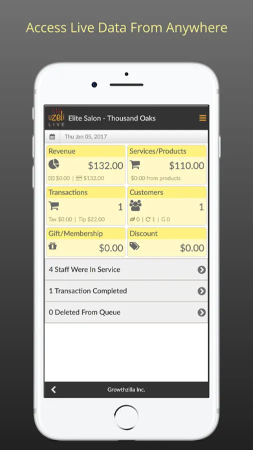 Uzeli Live provides you access to important data in real-time from your beauty salon, barbershop, massage shop or spa business. The information includes revenue, staff clock-in clock-out, number of client transactions and the detailed breakdown for each transaction.
