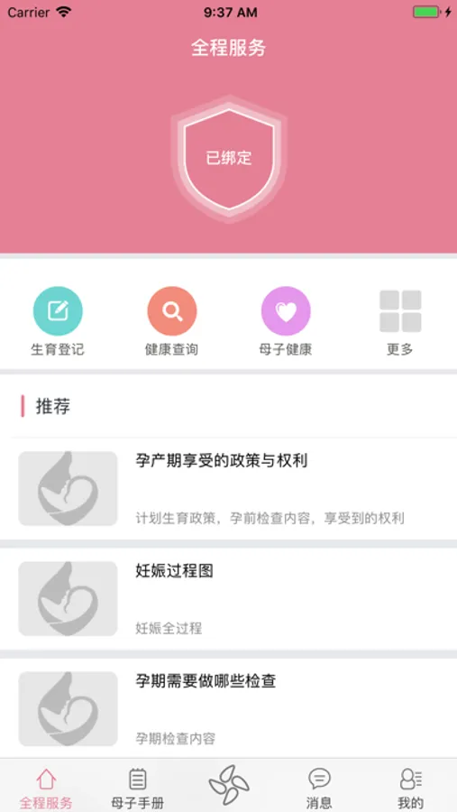 “小蝌蚪”呵护您的婚育健康。婚育全程服务APP包含生育登记、健康查询、附近机构、家庭绑定、知识推荐等功能。服务对象可以通过“小蝌蚪”或微信公众号快速查询或打印自己的服务记录,不需要再办理纸质证册。通过生育登记可以进入快捷登记页面,通过健康查询可以查询绑定的信息对应的体检记录。通过附近机构可以就近查询离得最近的可以提供服务的机构并且可以导航到机构地点。系统可以根据服务对象的特点自动推送个性化的知识内容