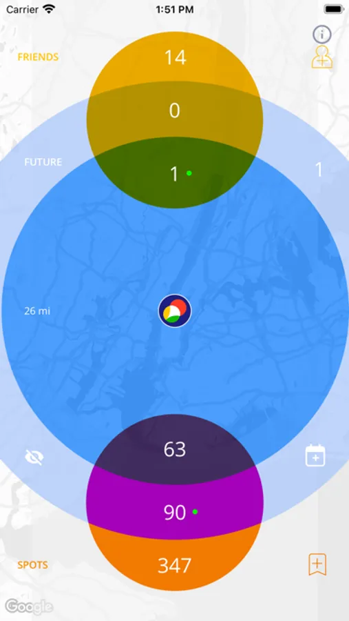 Set up a profile, add friends & Spots, then pinch and zoom to adjust your circle's radius to see who’s around you. Once your circle overlaps with a friend’s, send them a message.