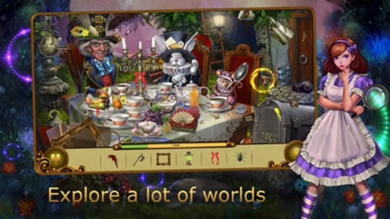 Small and adult searchers for pictures, silhouettes and words will be helped by magical hints. Family entertainment for the development of mindfulness in the casual game "Alice in Wonderland: Find an object" will please its guests with high-quality graphics, pleasant musical accompaniment, which makes the quest game even more atmospheric.