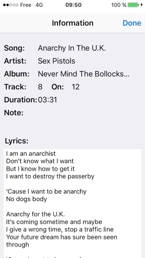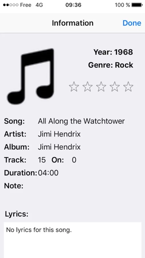 - Touch the information "I" image in rotation to access to the current song information: If the song is well set, you can access to the song's Lyrics !! (Need to feed your song with iTunes)