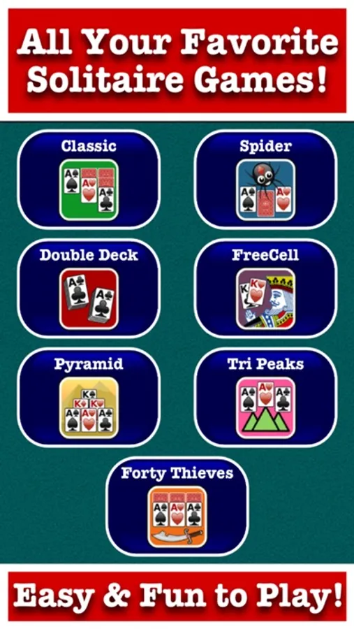 • Classic (Klondike) • Spider • Double Deck • Pyramid • FreeCell • Forty Thieves • Tri Peaks