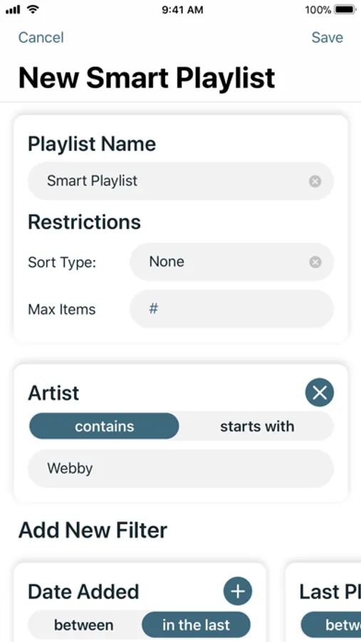 • Smart Playlists! Smart Playlists make it to iOS within Musik. See above for filter options.