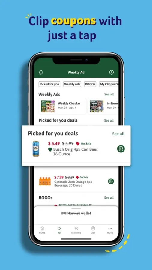 Say farewell to ordinary shopping and embrace extraordinary deals! With the Harveys app, access coupons, our weekly ad, and personalized offers right at your fingertips. You'll be saving even more on your favorite products with tailored deals just for you, plus a dedicated Savings tab for coupons. And the cherry on top? Discover BOGO offers in the Weekly Ad for your store and easily add them to your shopping list.