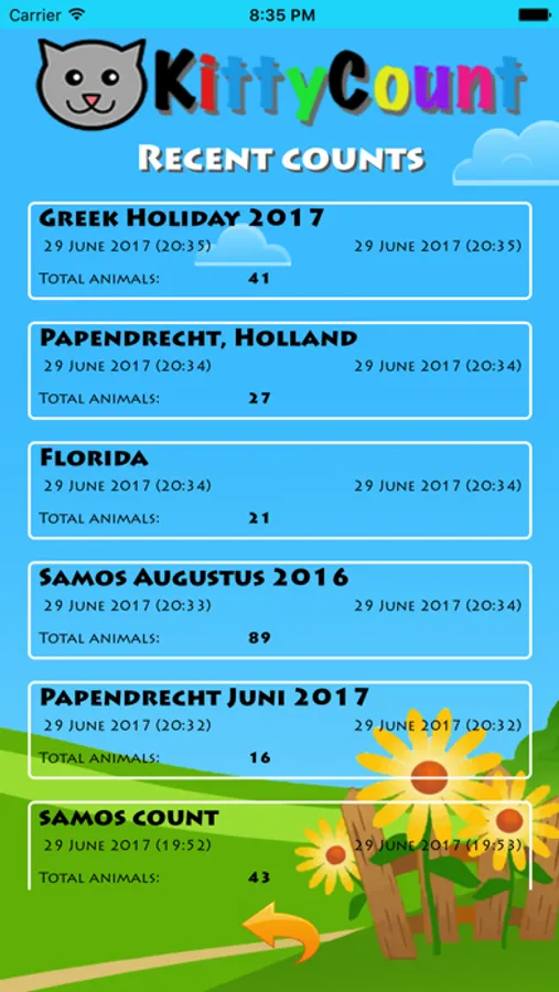 Simple app to count and register all cats, dogs, goats and horses that you see during a holiday to the Greek islands, for example. Have the perfect overview of how many cats you spotted exactly at the end of your holiday.