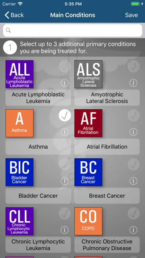 • Manage multiple health conditions at once (selecting from a large list of chronic conditions including: ALS, Alzheimer's, Asthma, COPD, Depression, HCM, Parkinson's, AFib, High Cholesterol, Heart Failure, Psoriasis, CF, Diabetes, Eczema, GCA, Osteoporosis, Hypoparathyroidism, RA, NMOSD, Common Cancers and more)