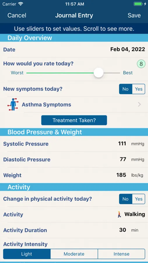 • Record and track symptoms over time, keep a journal of daily ups and downs, moods, notes, activities and vitals.