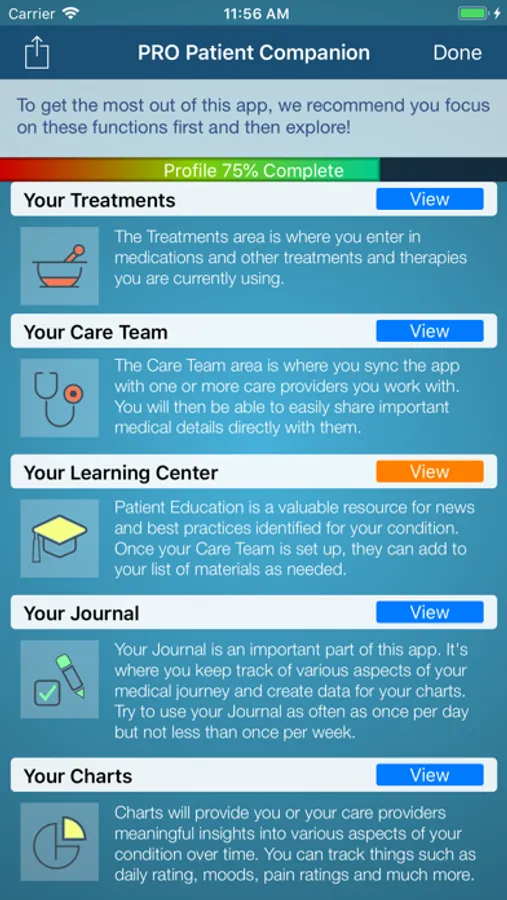 • Report your quality of life and other scientifically validated medical measures by completing simple surveys. The app will remind you when they are due.