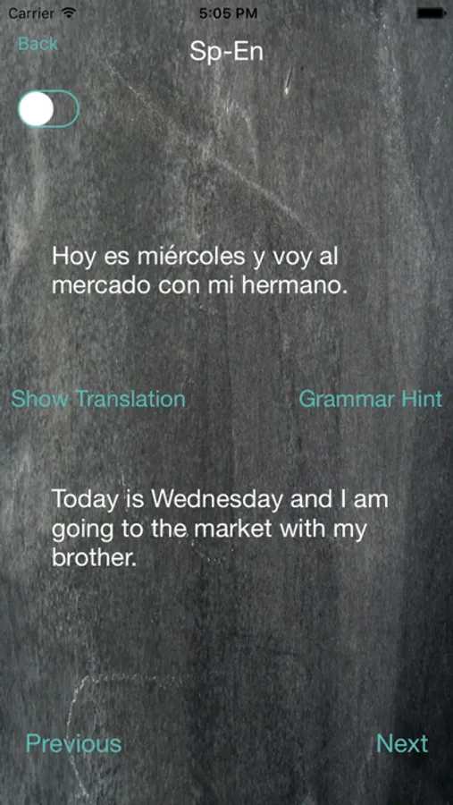 Each sentence on every level can be translated from ES-EN or EN-ES and comes with grammar hints to refresh basic conjugation and syntax.