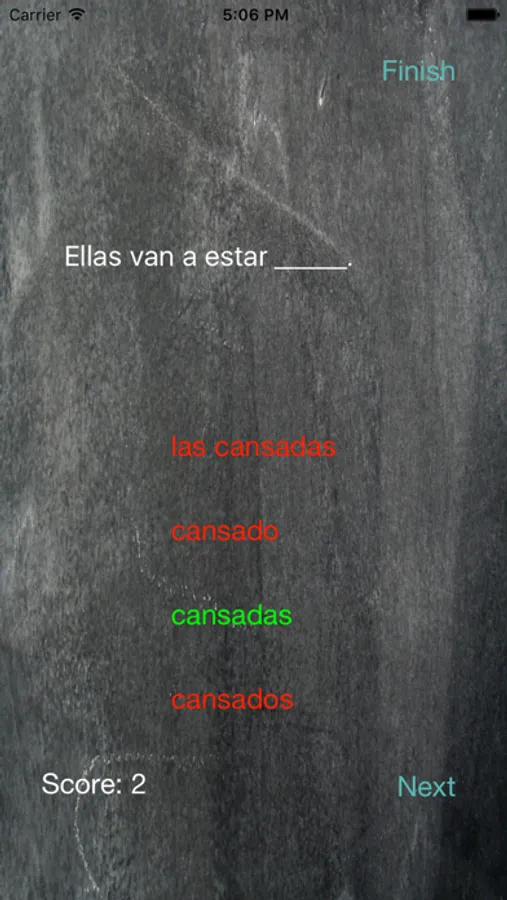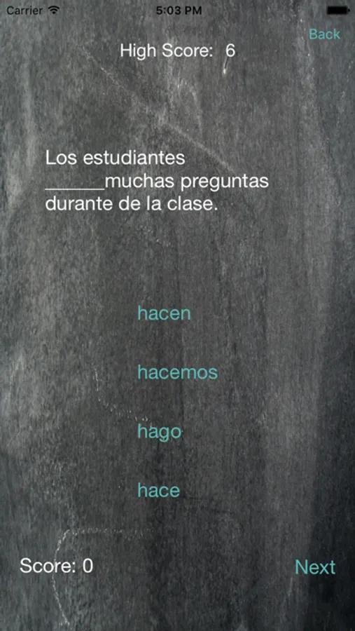 This Spanish quiz app has hundreds of Spanish to English sentences. Each level is geared to be progressive in nature. Aimed at an upper beginner/intermediate Spanish learner, it is a great way to brush up on your Spanish using progressively more difficult sentence building blocks.