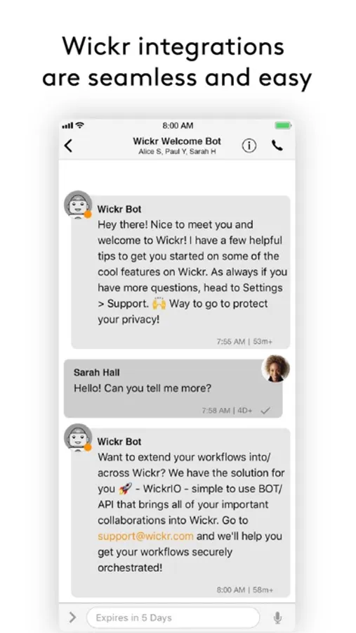 Wickr Enterprise is a self-hosted private Wickr Network where your organization can securely communicate. Install Wickr Enterprise on your corporate device to collaborate in a secure on-premise environment built with the world’s most advanced multilayered encryption and ephemerality. On Wickr Enterprise, you can privately communicate with your colleagues, place encrypted calls and hold video conferences, send encrypted files and collaborate in secure rooms.
