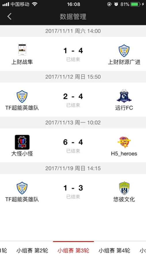 5录入比赛结果,支持详细技战术数据(进球,助攻,抢断,乌龙,点球,换人,红黄牌… …)