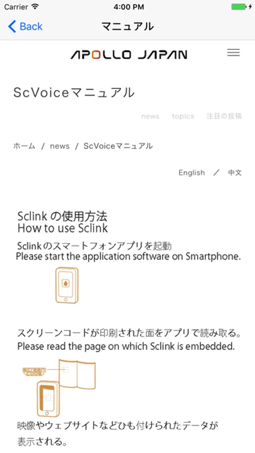 このアプリは、アポロジャパン社が開発したScreenCodeを読み取る事でリンクした音声ファイルを再生する事ができます。