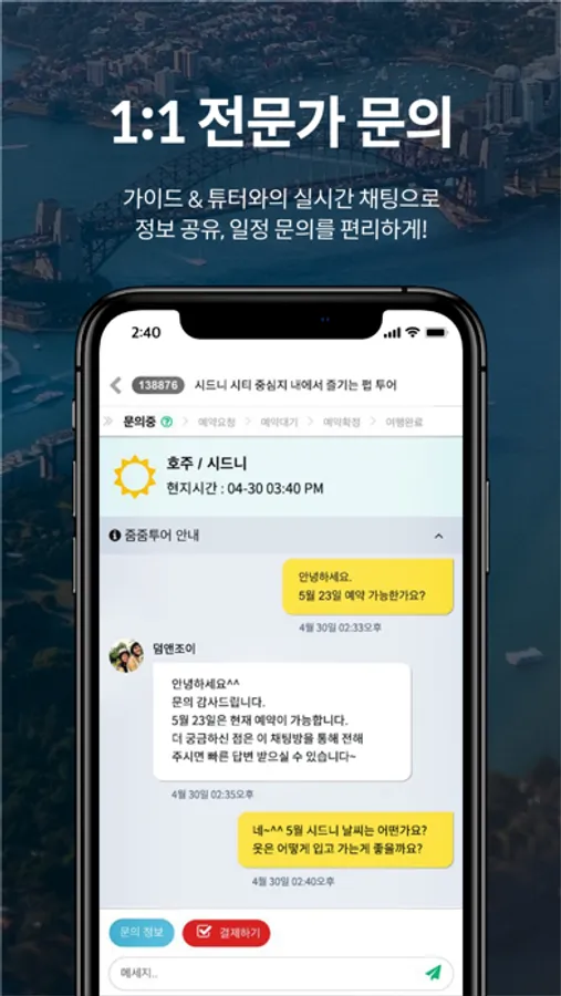 편리한 1:1 채팅 기능으로 여행 전문가와 실시간 커뮤니케이션 가능