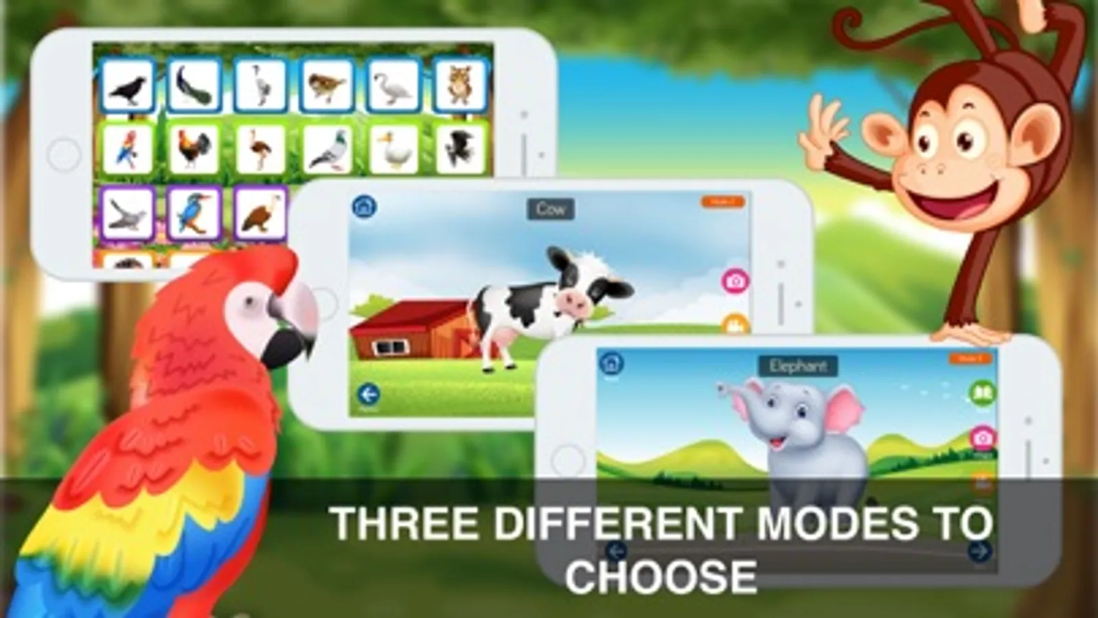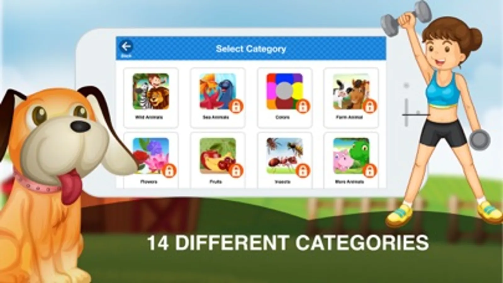 ⁃ Different Categories — Birds, Body Parts, Colors, Farm Animals, Flowers, Fruits, Insects, More Animals, Musical Instruments, Sea Animals, Shapes, Vegetables, Vehicles, Wild Animals