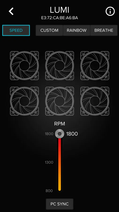SPEED: Lets you control the fan speeds of the 6 connected fans. The “PC SYNC” button is for toggling control of the fan speed between the LUMI mobile app and you PC’s PWM.