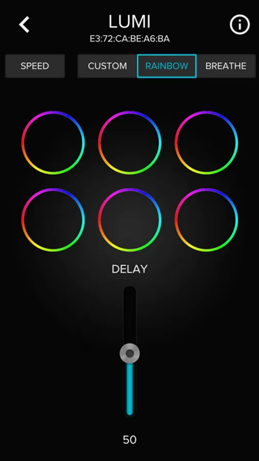 RAINBOW: Puts all connected devices into a rainbow color breathing mode, in which the lights cycle through all available colors. The delay between each color transition can be adjusted with the “Delay” slider.