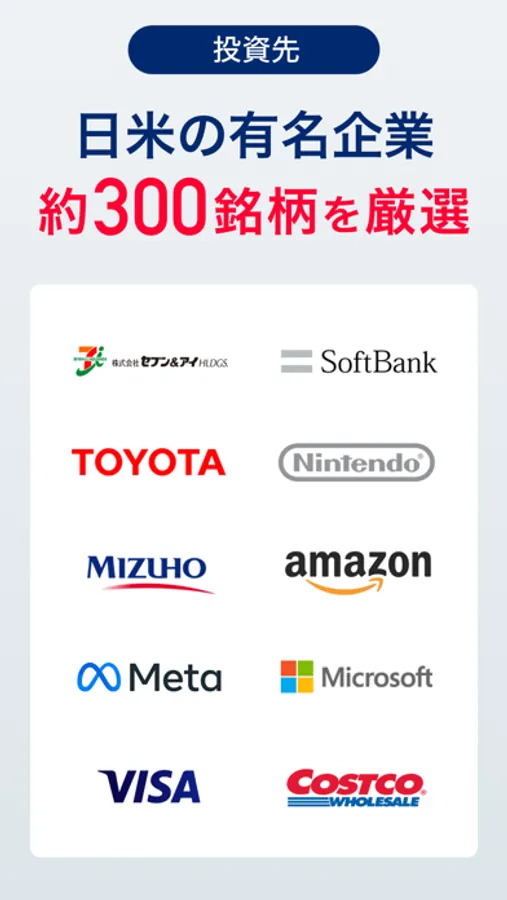 1.1,000円で日米の有名企業の株式、厳選された投資信託を購入