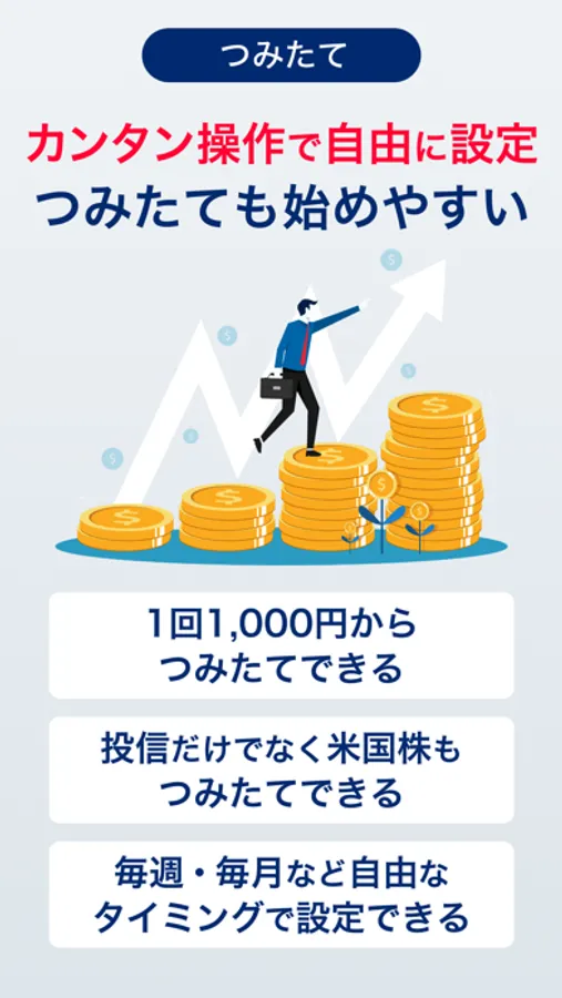 米国株・投資信託なら毎週、毎月などお好きな頻度で1回1,000円から定期購入するつみたて投資ができます。