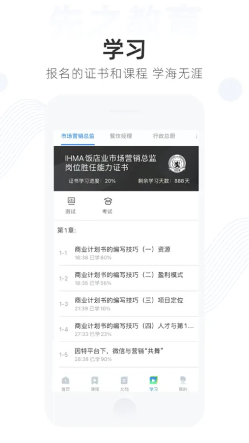 先之云课堂是先之教育旗下产品,针对旅游服务行业用户倾情打造的在线学习平台。学员可以通过平台随时随地观看先之云课堂的IHMA证书课程。