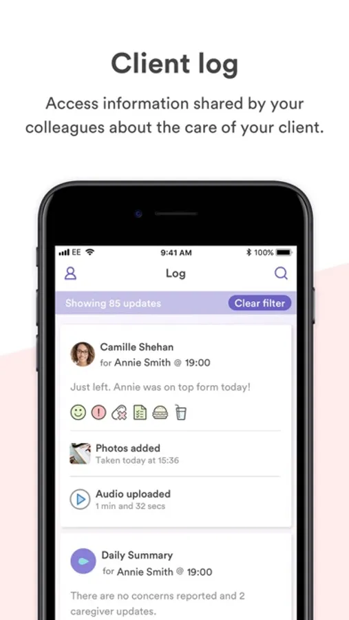 • Receive daily wellbeing summary on the client’s care visits and always have the latest information at hand