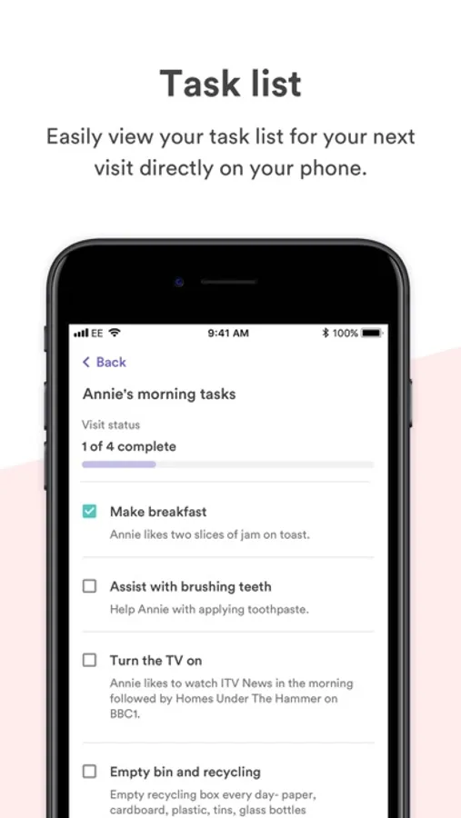 • Know what tasks need to be done and what other care workers have done in previous visits