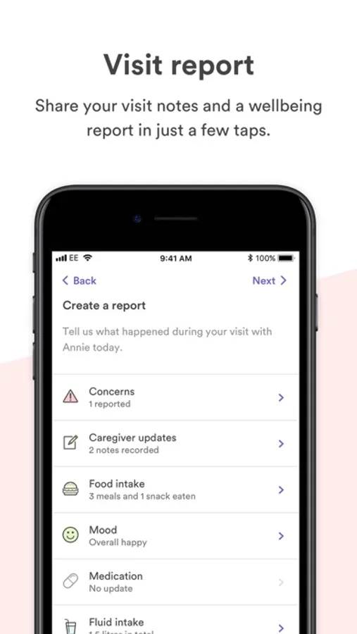 • Fill in a digital care log and a wellbeing update after each visit