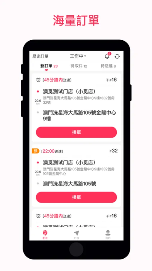 澳覓專送是澳覓 App 為專業配送團隊 定制的外賣配送軟件,配合後台調度系統,幫助騎手有效地為澳覓商家和用戶提供服務。功能支持:接受訂單信息、不同狀態的訂單處理操作、每單統計等。