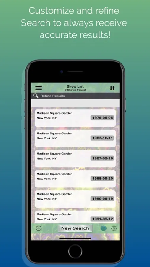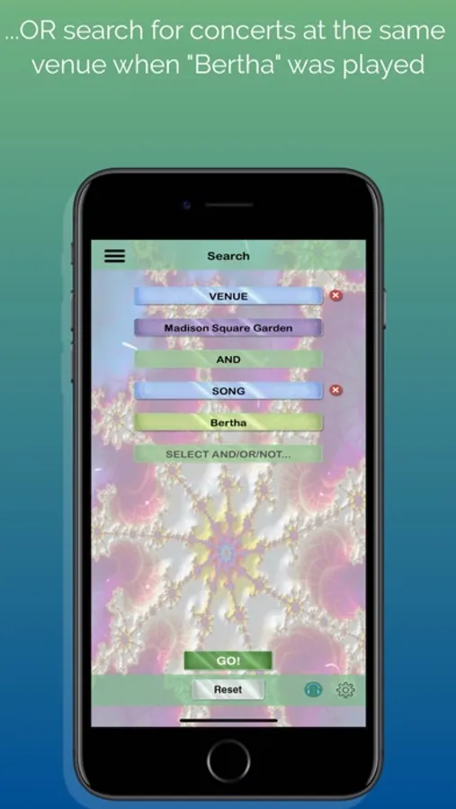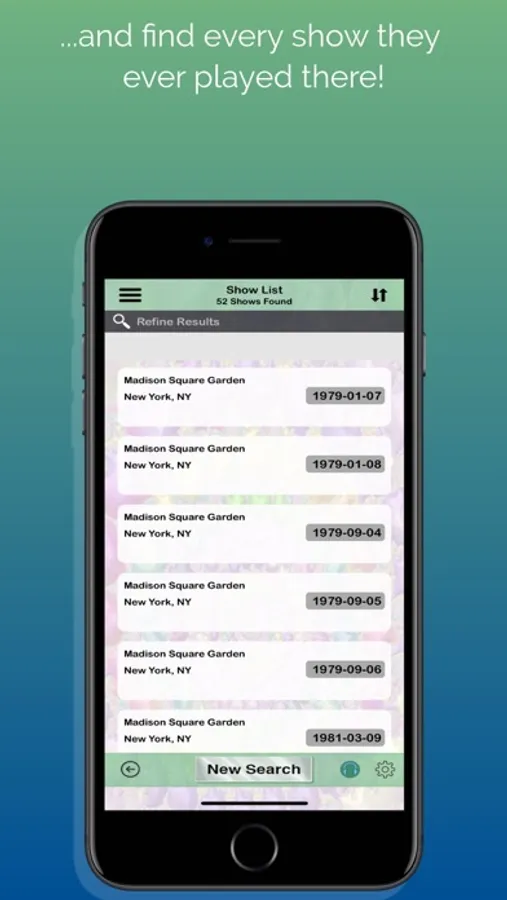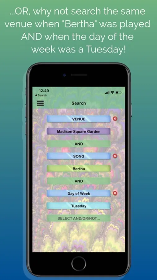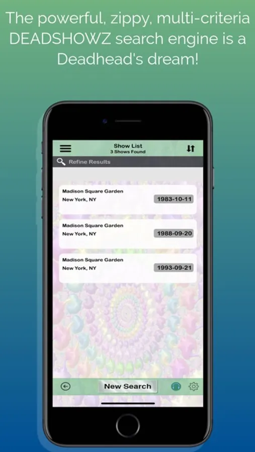 For example and as the screen shots here demonstrate, DEADSHOWZ can search for every show at Madison Square Garden, or every show at Madison Square Garden that featured "Bertha", or every show at Madison Square Garden when they played "Bertha" and the show was on a Tuesday! This multi-criteria search capability means that DEADSHOWZ users can get a list of every show ever played on their (or a friend’s or family member’s) birthday, anniversary or other milestone, a list of every show featuring a specific Guest Artist, all shows from a specific year or city, and myriad other options available via its proprietary and ultra-powerful search engine...making DEADSHOWZ the only mobile Grateful Dead reference a Deadhead will ever need.